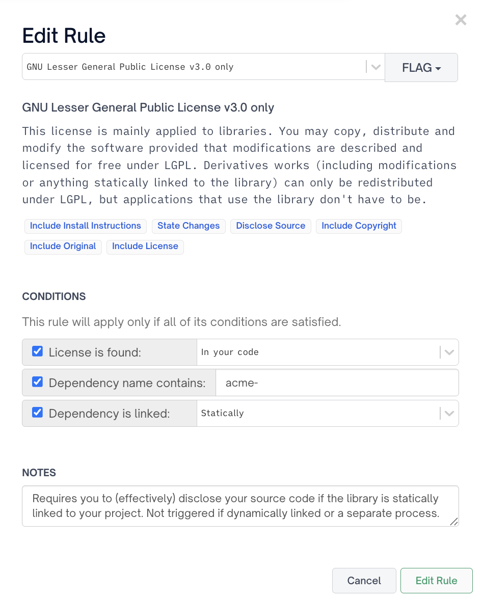 By customizing these conditions, you can refine how FOSSA identifies and flags potential license issues, ensuring that your compliance processes are both thorough and appropriate for your organization's needs.