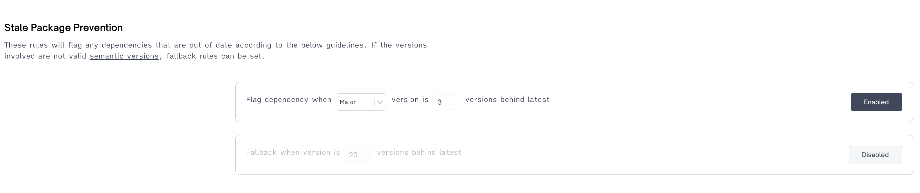 Outdated packages carry increased security risk and prevent your team from utilizing newer features. To enforce up-to-date packages, you can enable rules to flag packages by semantic version, ordered versions, or both. Package matching either rule will be flagged as issues.