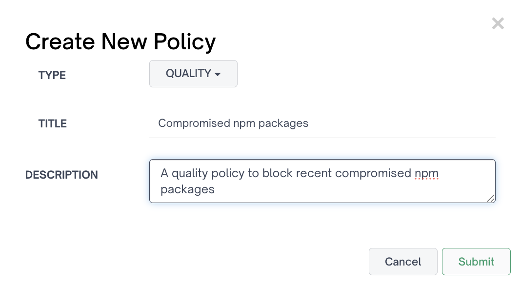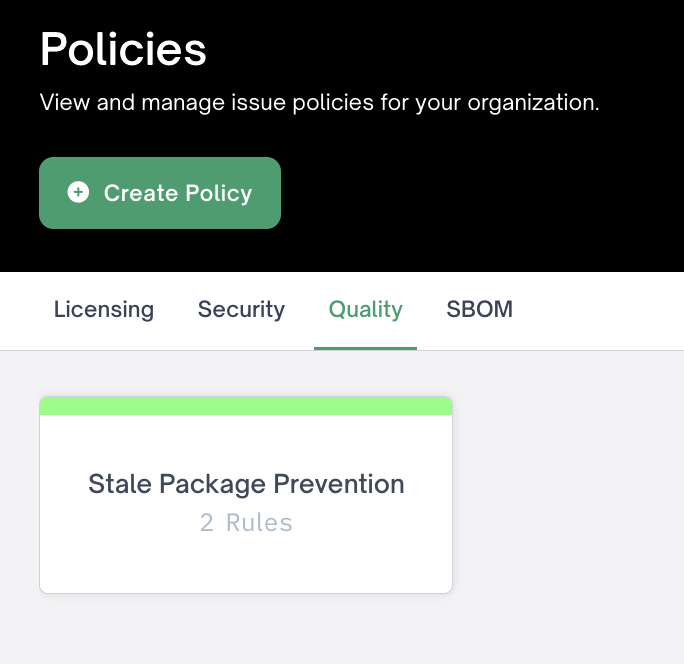 To create a new code quality policy, navigate to the quality tab of the policy configuration menu and click create policy.
