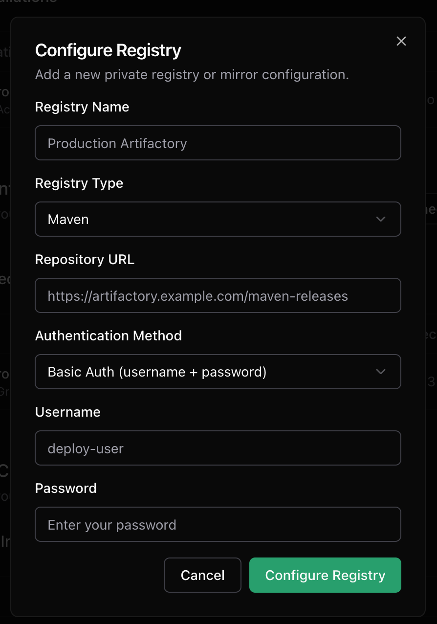Credentials to a Maven-style code mirror can be configured in Organization Settings. Common examples of this are Artifactory, Sonatype Nexus, and GitHub Packages for Maven.
