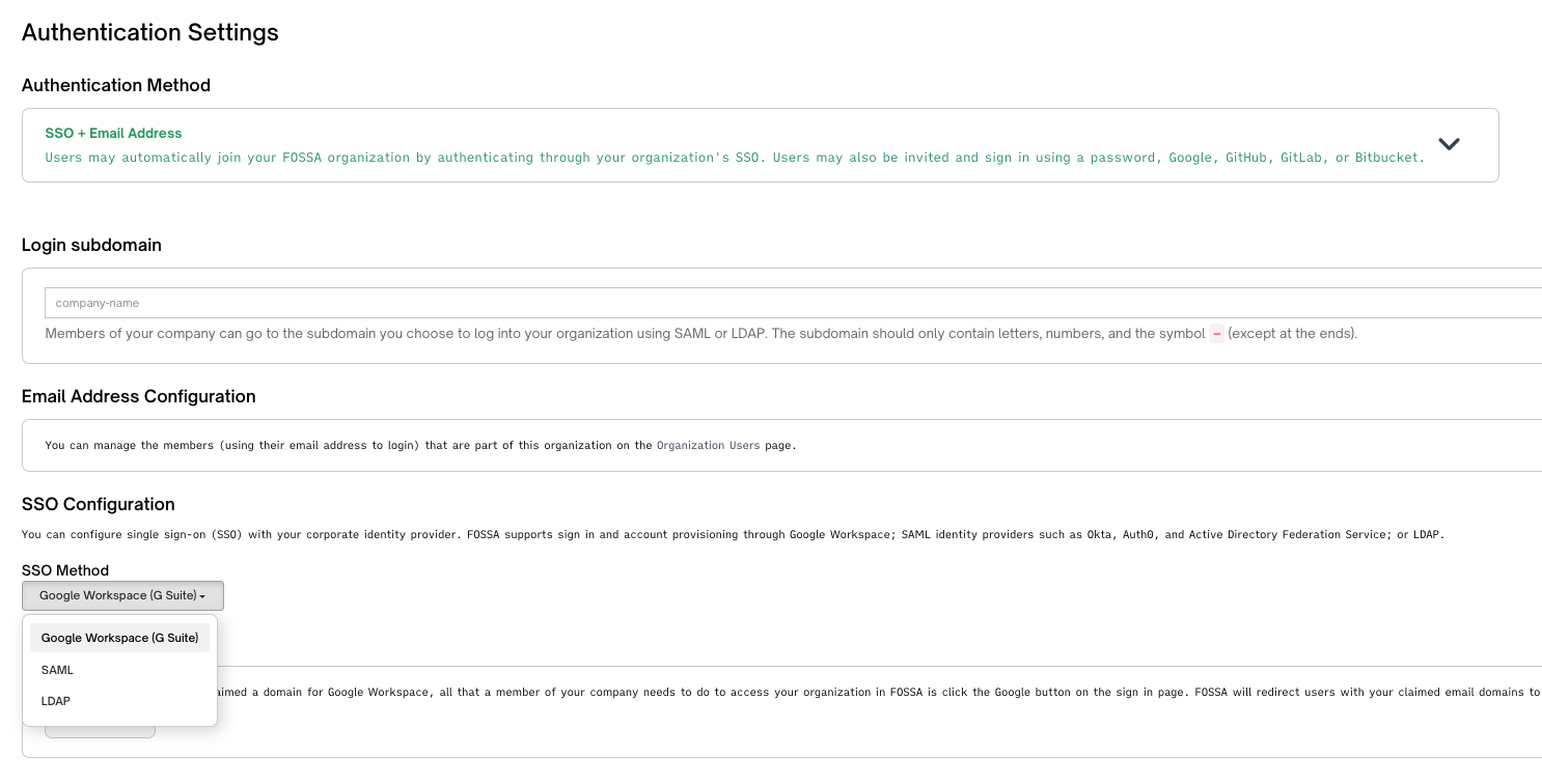 To connect FOSSA to Google Workspace, go to Organization Settings → Organization → Authentication. You can set Google Workspace as the SSO method in one of two ways: