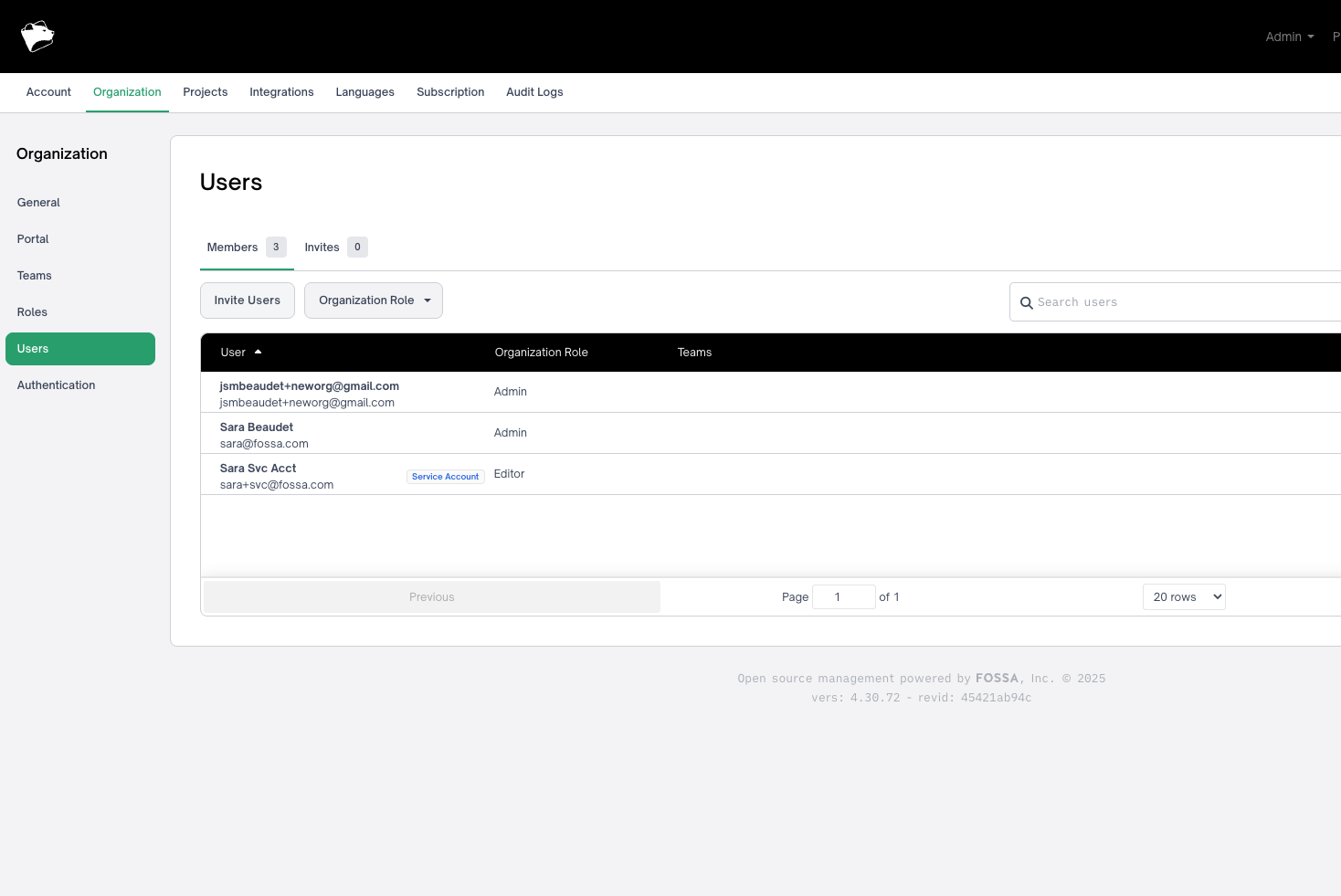 Navigate to Organization → Users. Service accounts appear with a "Service Account" badge.