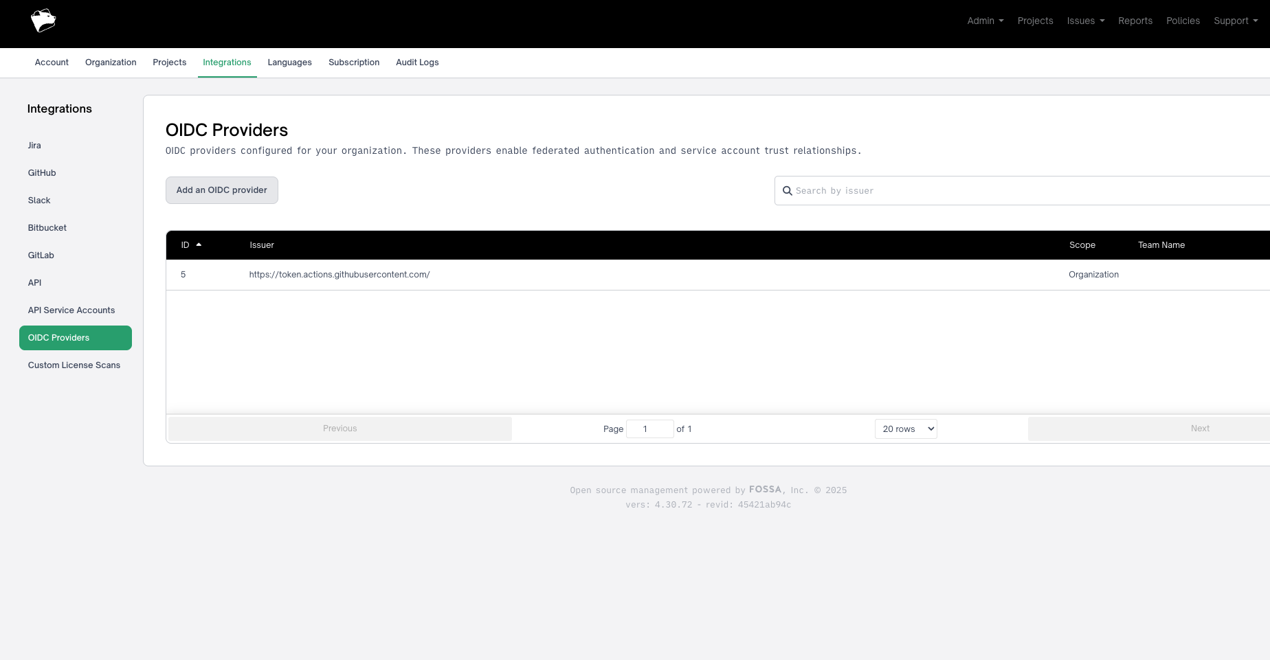 OpenID Connect (OIDC) authentication allows you to exchange JSON Web Tokens (JWTs) from trusted identity providers for FOSSA API tokens. This eliminates the need to manage long-lived credentials in CI/CD pipelines and Kubernetes clusters.