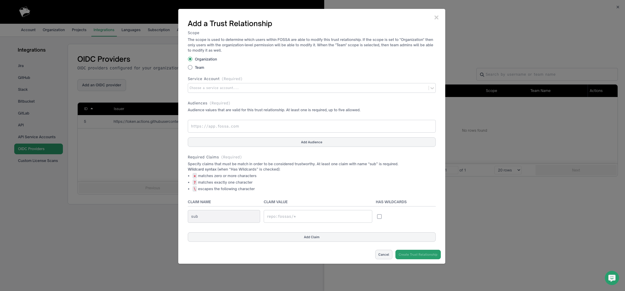 Navigate to Integrations → OIDC Providers, click the view icon for your provider, then click Add a trust relationship.