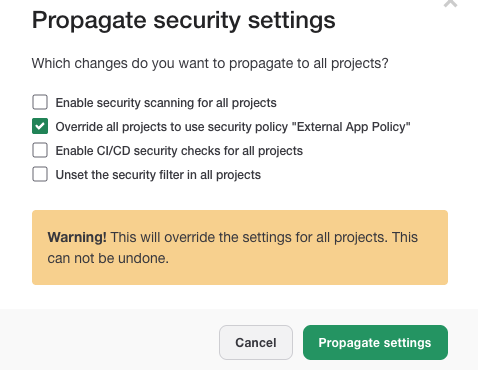 Propagate settingsand chooseOverride all project to use security policy "Some Security Policy"