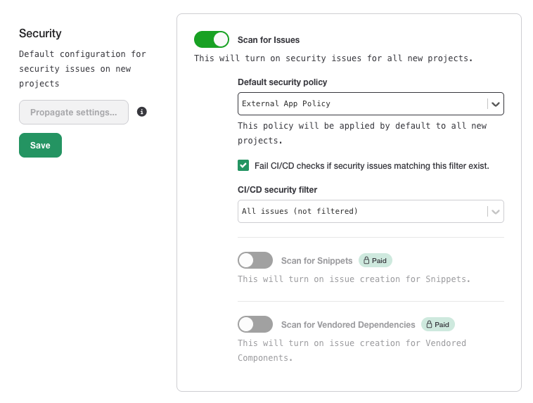 Manage default project settings across your organization. For each settings group, such as Security, Licensing, or Quality settings, you have two options, Save or Propagate settings