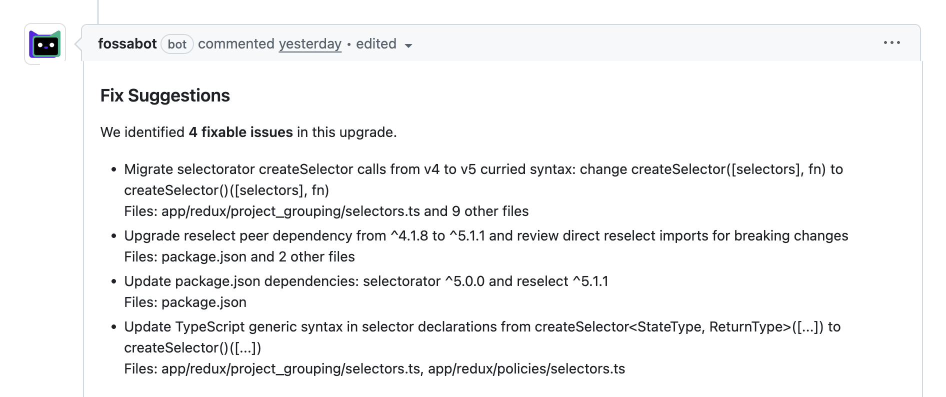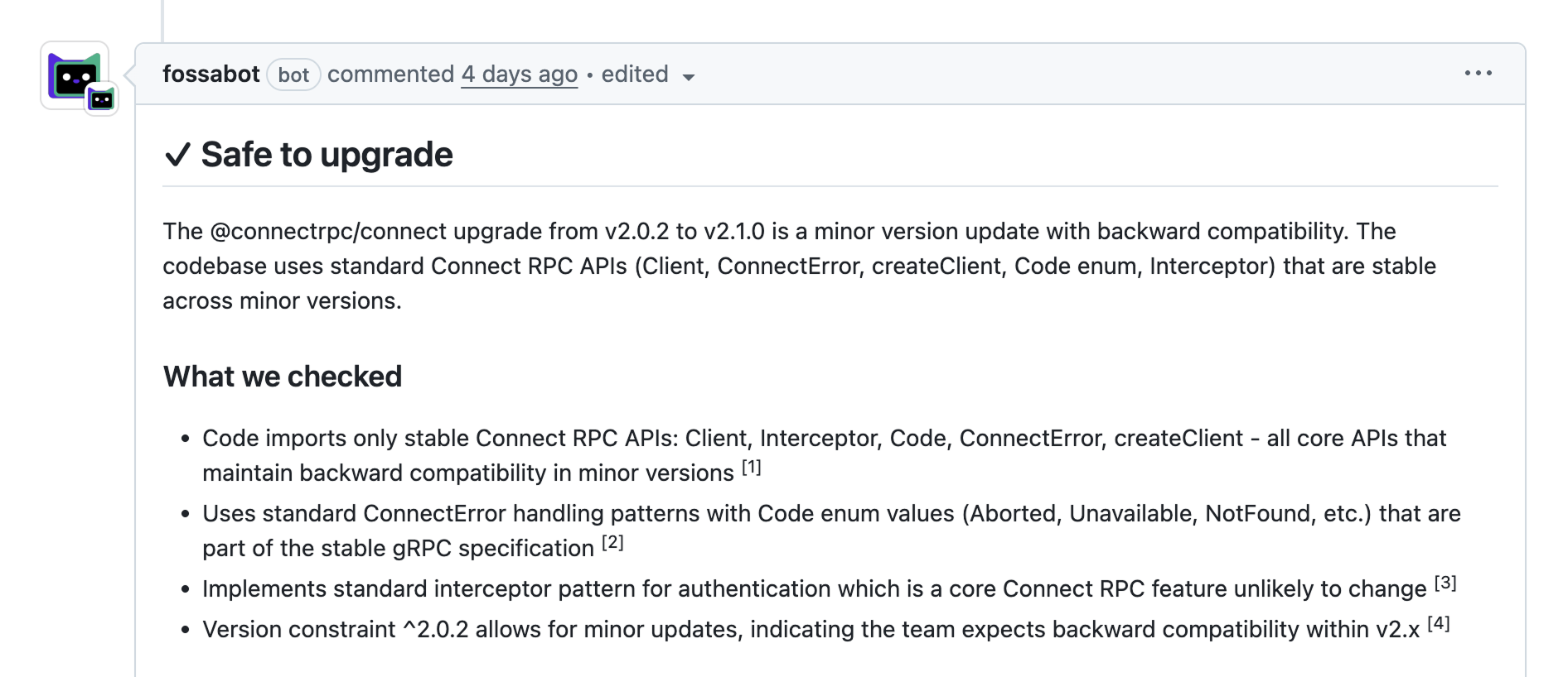 fossabot works with existing dependency update tools you might already have: Dependabot, Renovate and Snyk. When Pull Requests from these tools are detected, fossabot can automatically analyze the proposed upgrade for breaking changes and determine if your application is impacted by the changes.