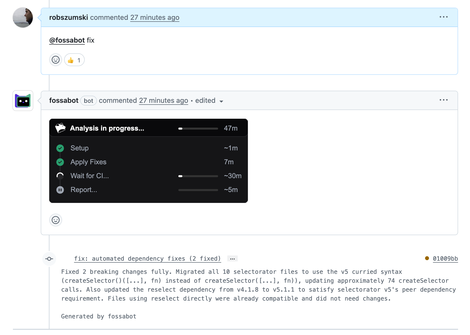 fossabot is an AI Agent for making strategic dependency updates and is capable of large complexity upgrades – the ones that require a senior engineer because they’re always an unexpected multi-hour research and coding task.