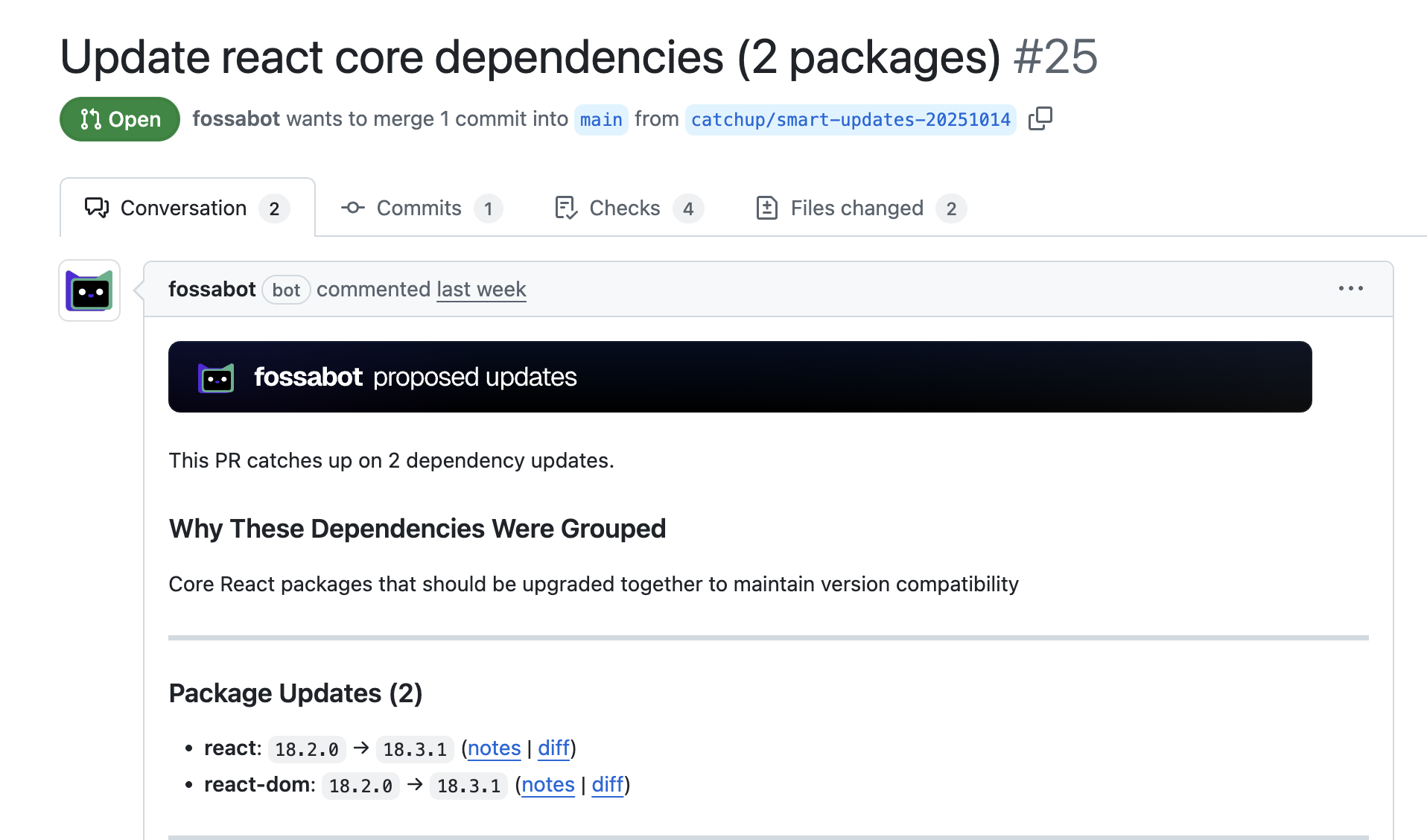 fossabot can propose its own intelligent updates, which allows you to easily catch up on your dependency upgrade backlog. By default, these Pull Requests will group together a set of dependencies that should be upgraded together, without any configuration required.